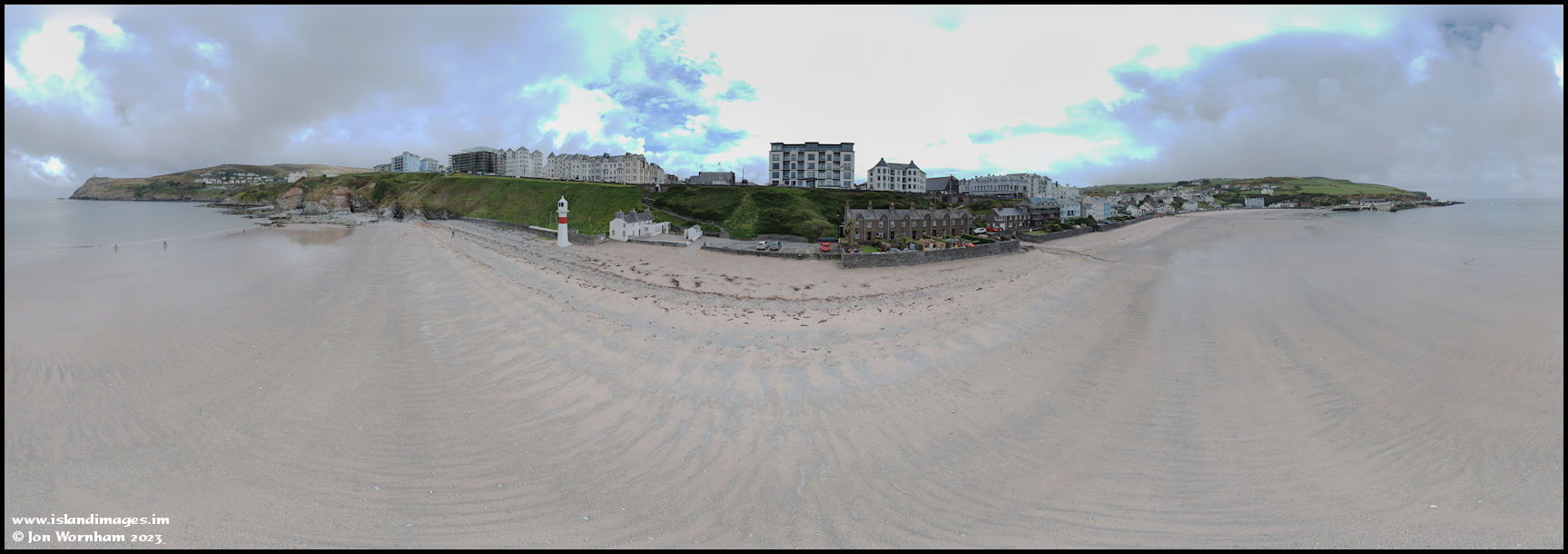 A low level aerial panorama by the lighthouse on Port Erin Beach