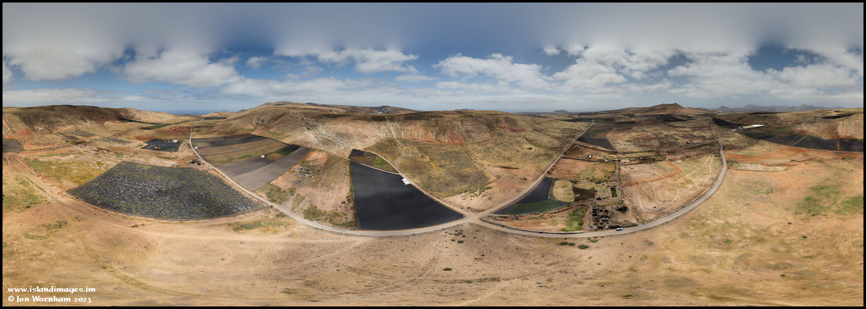 Flying a little further up the valley for a more general view. The native soils of Lanzarote are very poor, but crops grow on a bed of crushed volcanic lava, which collects and retains moisture, hence the black fields.