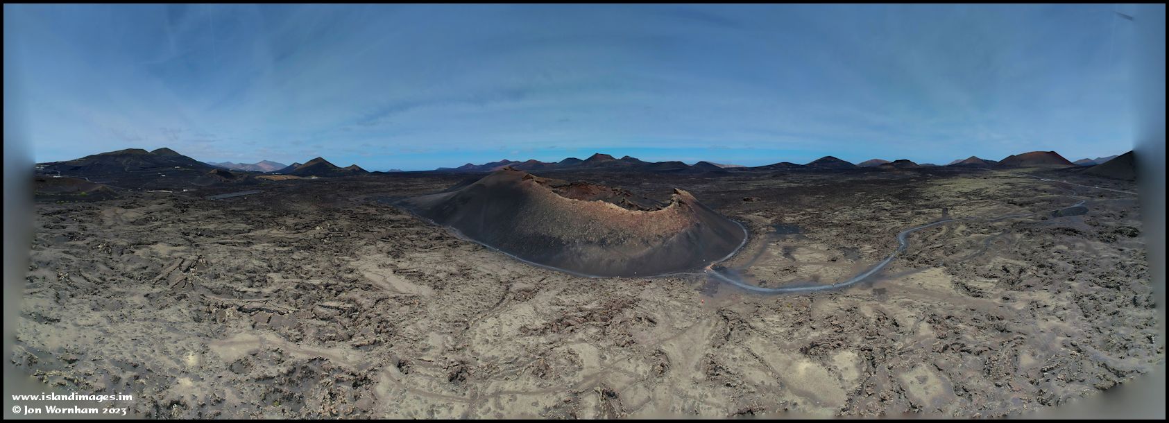 The volcano cone of Montana Cuervo, surrounded by green lichen covered lava.