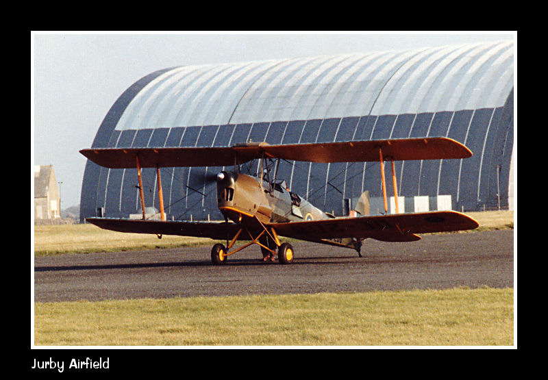 Ronaldsway based De-Havilland Tiger Moth, DE208, seen in front of the Advanced Airships hanger at Jurby. This aircraft had a dedicated grass landing strip at Ronaldsway