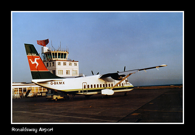Manx Airlines Short 360, G-BKMX, stands in front of the old wooden departure pier, note also the AR1 radar scanner mounted on the control tower