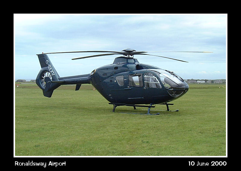 Eurocopter EC135 G-BXXV parked on the grass by the east apron