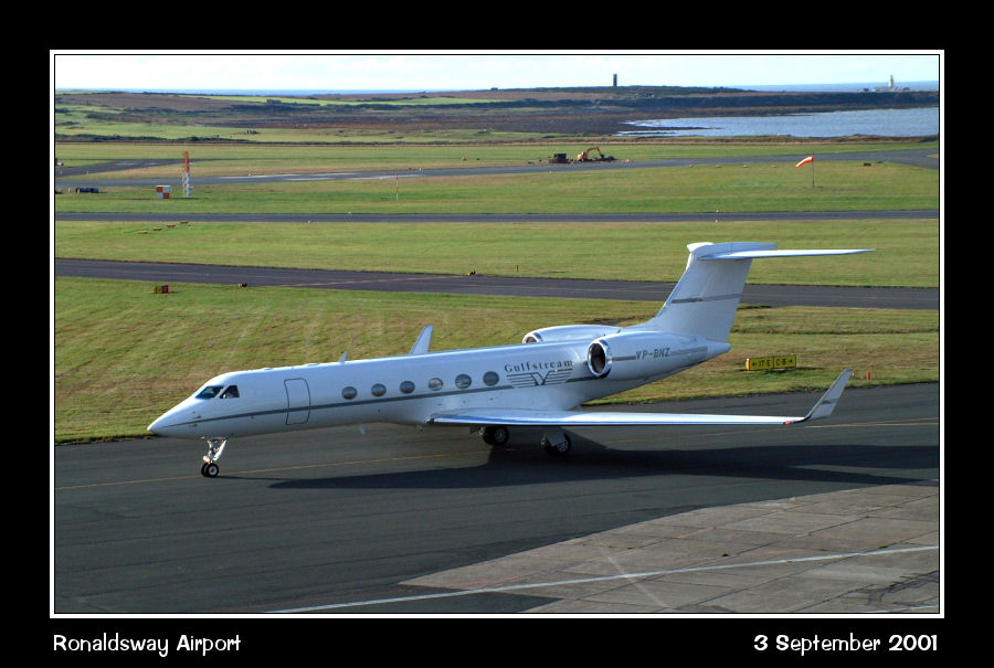 Gulfstream 5, VP-BNZ, taxies in front of the control tower