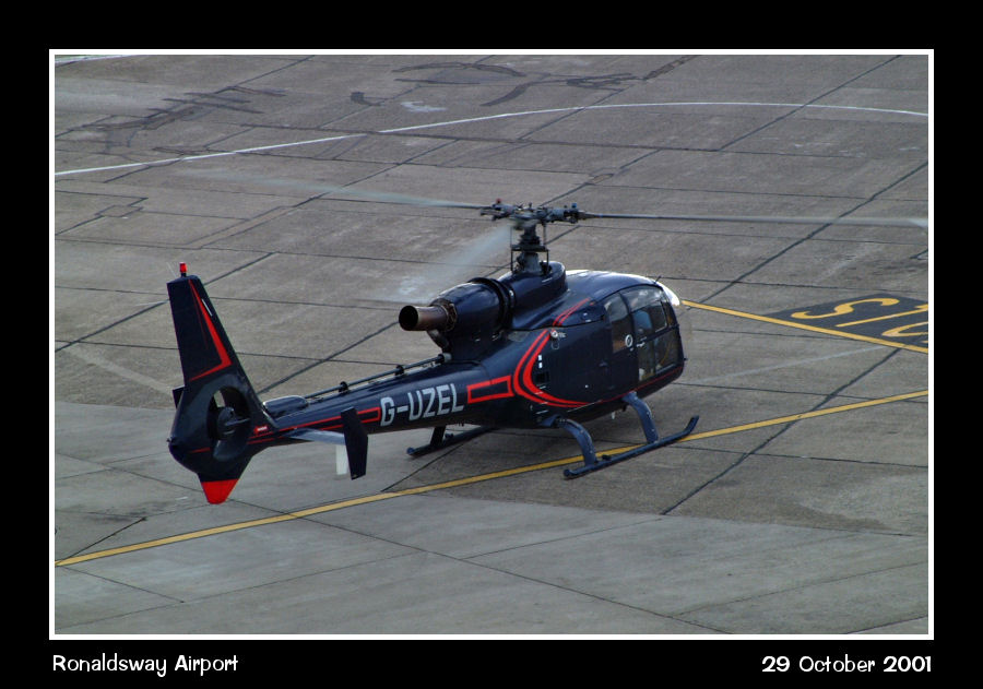 Locally based Gazelle, G-UZEL, parked unusually at the base of the control tower