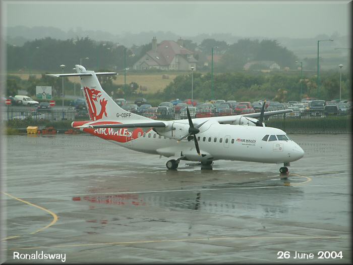 Air Wales' ATR42, G-CDFF, stands on a rain soaked apron.