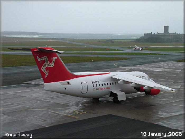 EuroManx RJ70, EI-CPK, parked on the apron on a very dull day.