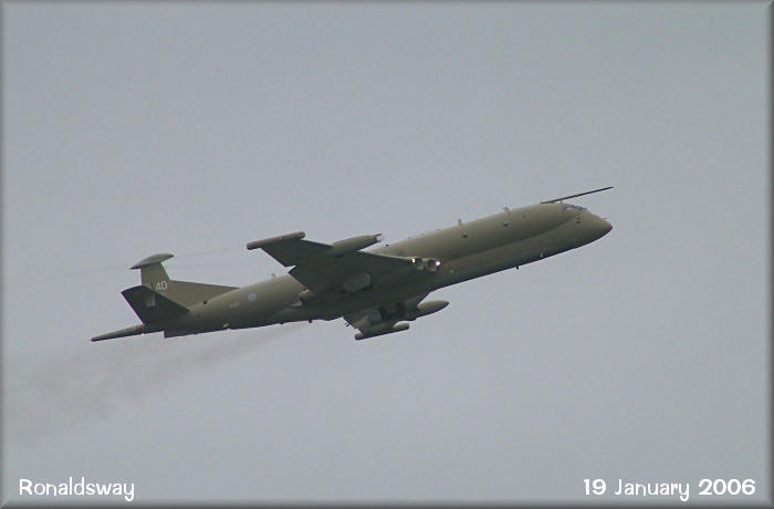 RAF Kinloss Wing Nimrod MR2a, XV240, climbs away after an ILS approach to go-around at Ronaldsway, before commencing patrol over the Irish Sea.