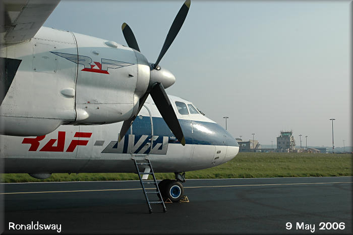 Another view of RafAvia AN26, YL-RAB, with the Ronaldsway control tower