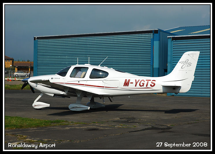 Manx registered Cirrus SR20 GTS, M-YGTS parked in the hanger area