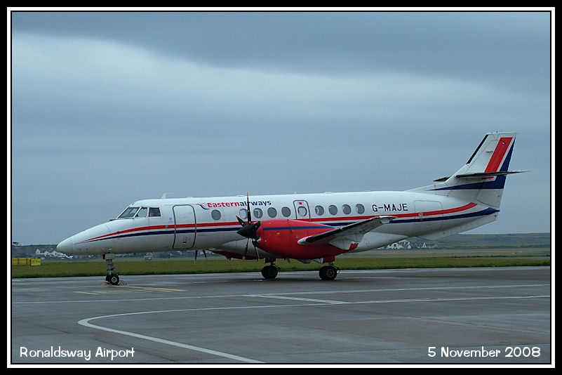 Stil painted in their old colours, Eastern Jetstream 41, G-MAJE is parked on the east apron