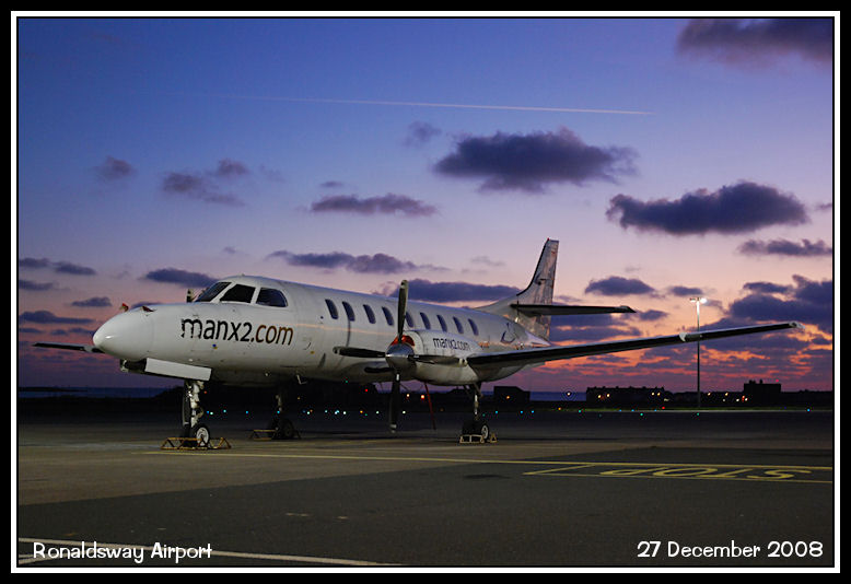 On the west apron, Manx2 Metroliner, D-CSAL against a sunset sky