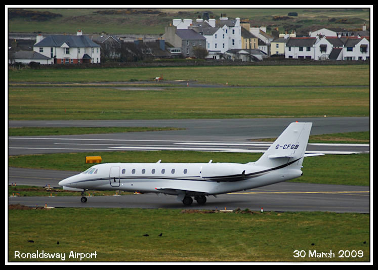 Cessna Citation Sovereign G-CFGB, with the houses of Derbyhaven behind