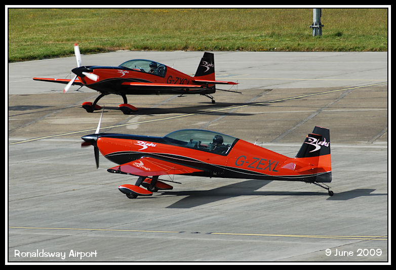 'Blades' Extra 300s G-ZEXL & G-ZXCL taxi for depature to Sywell after diplaying at Douglas the previous evening