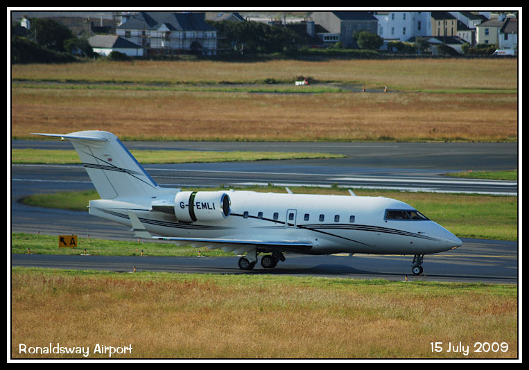 Challenger 604 G-EMLI taxies in using the thrust reversers to keep speed down