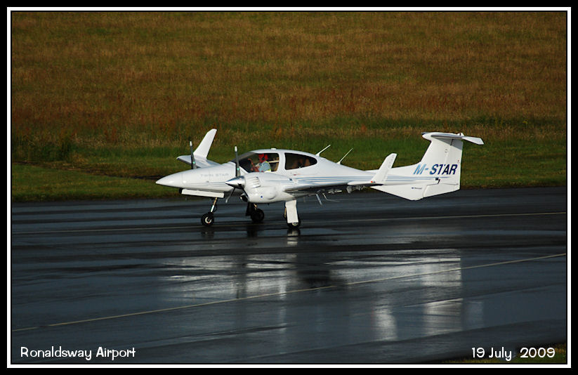 Diamond Twin Star, M-STAR, reflecting on a wet taxiway after a heavy rain shower