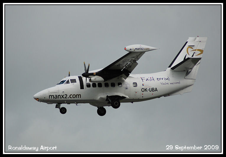 Manx2 Let 410 OK-UBA complete with tip tanks, on final for runway 26
