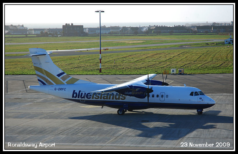 Blue islands ATR42, G-DRFC, taxies in after arriving from the Channel Islands