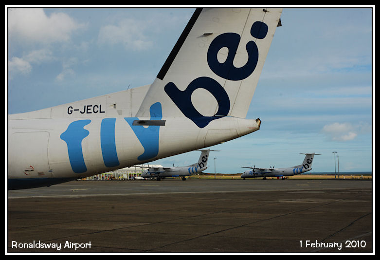 Three of four currently based FlyBe Dash8-Q400s - G-JECL, G-JEDI & G-ECOB