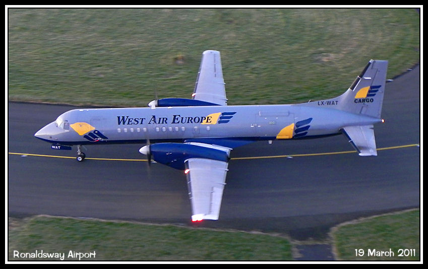 West Air ATP LX-WAT taxies for the EAM hanger after arriving at first light for maintenance.