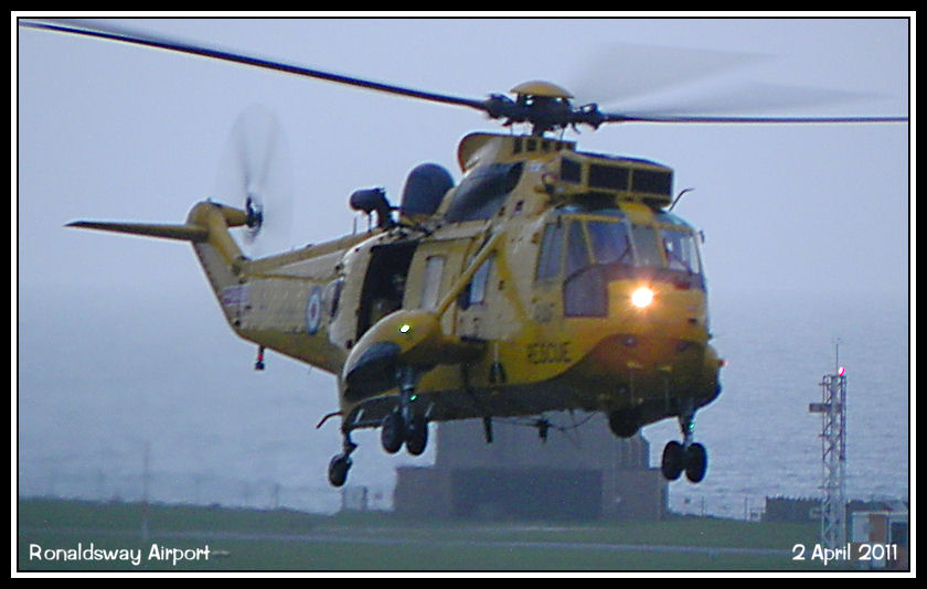 RAF 22 Sqn Sea King XZ596/L arrives at dusk for a refuel after SAR ops in the Irish Sea