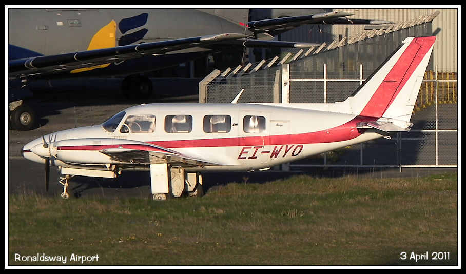In long term storage at Ronaldsway, Piper Navajo EI-WYO pictured in the evening sun
