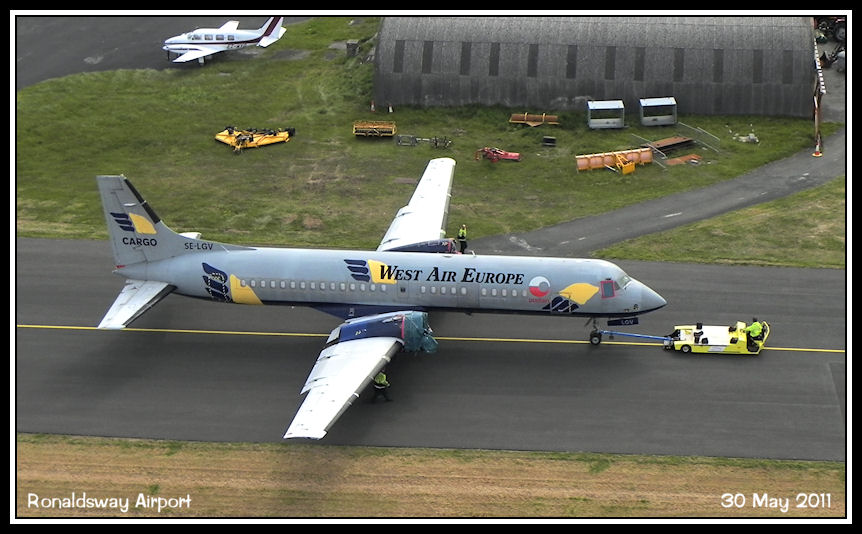 Engineless West Air ATP SE-LGV is moved from its long term storage area to the EAM hanger