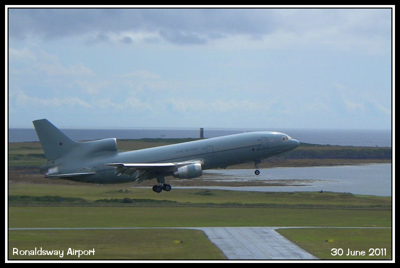 Holding the landing attitude, Tristar ZE705 passes in front of the control tower