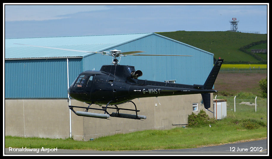 Squirrel helicopter G-WHST arriving from the north of the island for fuel