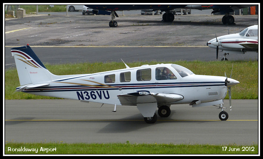 Ronaldsway based Beech Bonanza N36VU taxies for departure