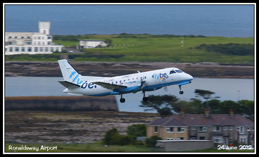 Loganair Saab 340 G-LGND climbs past Derbyhaven on a Glasgow flight