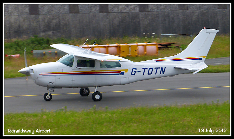 Ronaldsway based Cessna Centurion G-TOTN taxies to the hanger