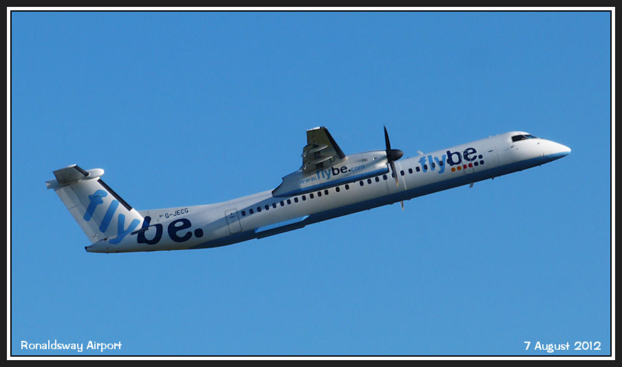 FlyBe Dash8-Q400 G-JECG climbs away steeply after departing from runway 26