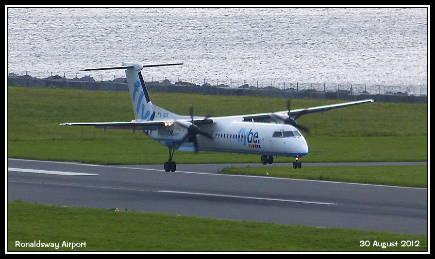 FlyBe Dash8-Q400 G-JECR about to touch down on runway 26 with a northerly crosswind