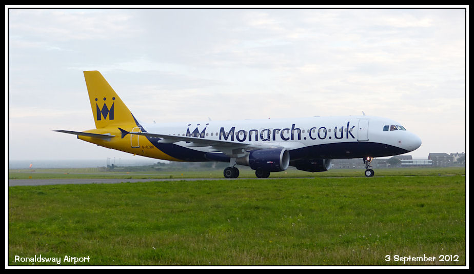 Monarch Airbus A320 G-OZBK enters the apron after operating a charter flight from Madeira