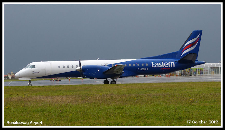 Operating the London City route in place of the usual BA liveried aircraft, Eastern Saab 2000 G-CDKA taxies for departure