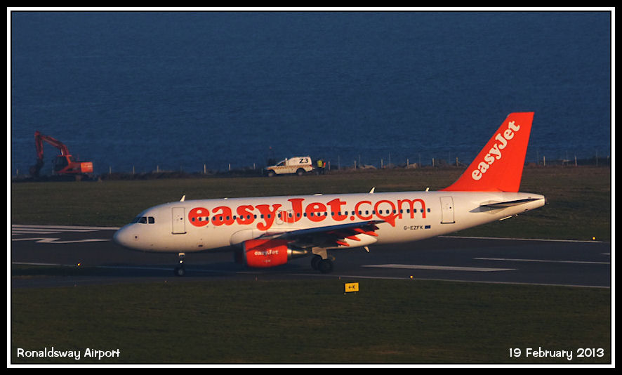 EasyJet Airbus A319 G-EZFK illuminated by a warm late afternoon sun as it vacates runway 08
