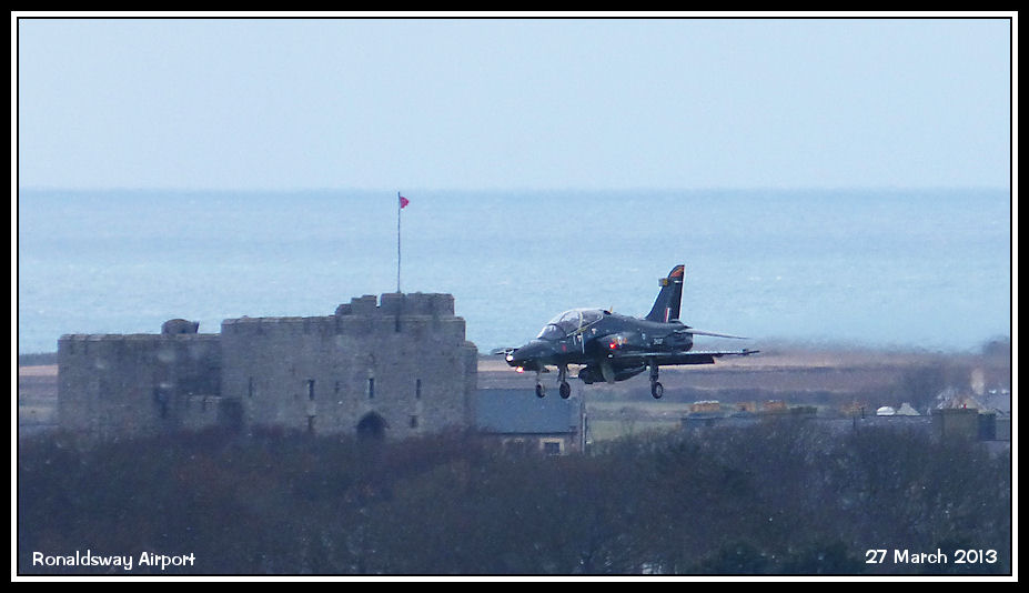 RAF 4 Sqn Hawk T2 ZK037 on final for runway 08 with Castle Rushen as backdrop