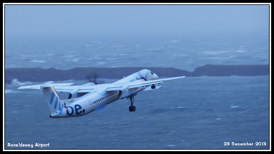 With a rough sea as backdrop, FlyBe Dash8-Q400 G-KKEV climbs away from runway 21 heading for Manchester