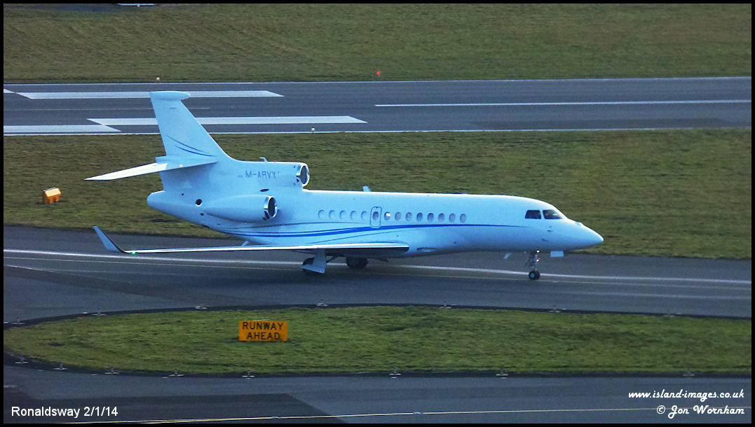 New on the Manx register, Falcon 7X M-ARVY taxies in after arrivng at Ronaldsway