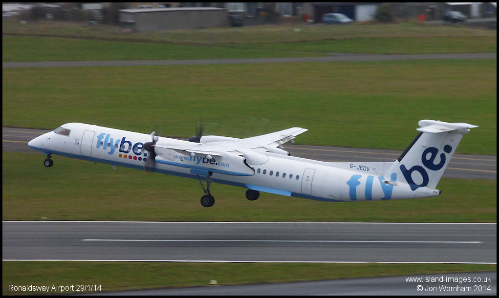 FlyBe Dash8-Q400 G-JEDV departing from runway 08 at Ronaldsway