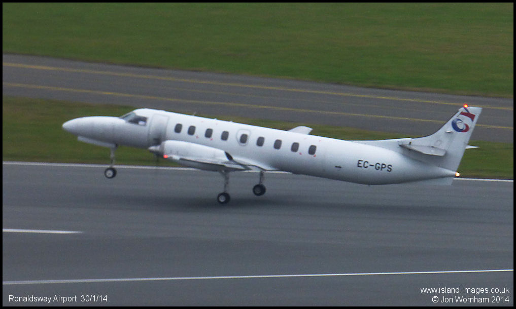 Metroliner EC-GPS lifts off from runway 08 at Ronaldsway, destination Barcelona