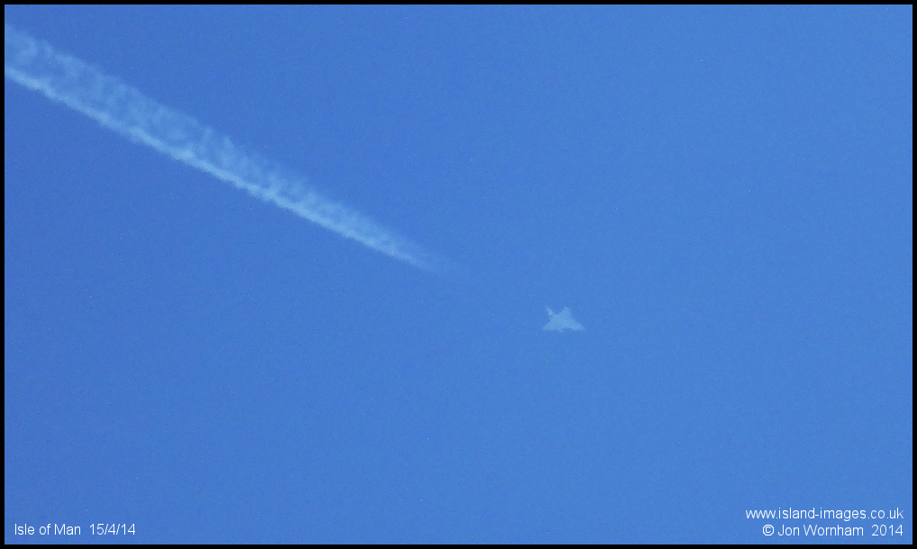 Second of a pair of Typhoons heading northwest over the IOM on test from Warton at 40,000ft +