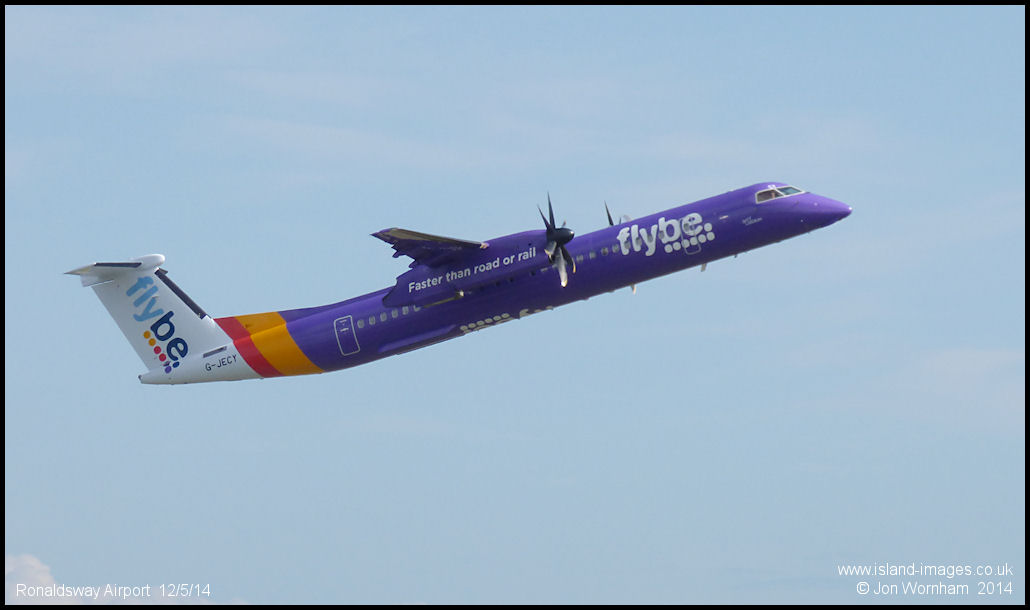 FlyBe Dash8-Q400 G-JECY climbs away from Ronaldsway, operating a Liverpool service