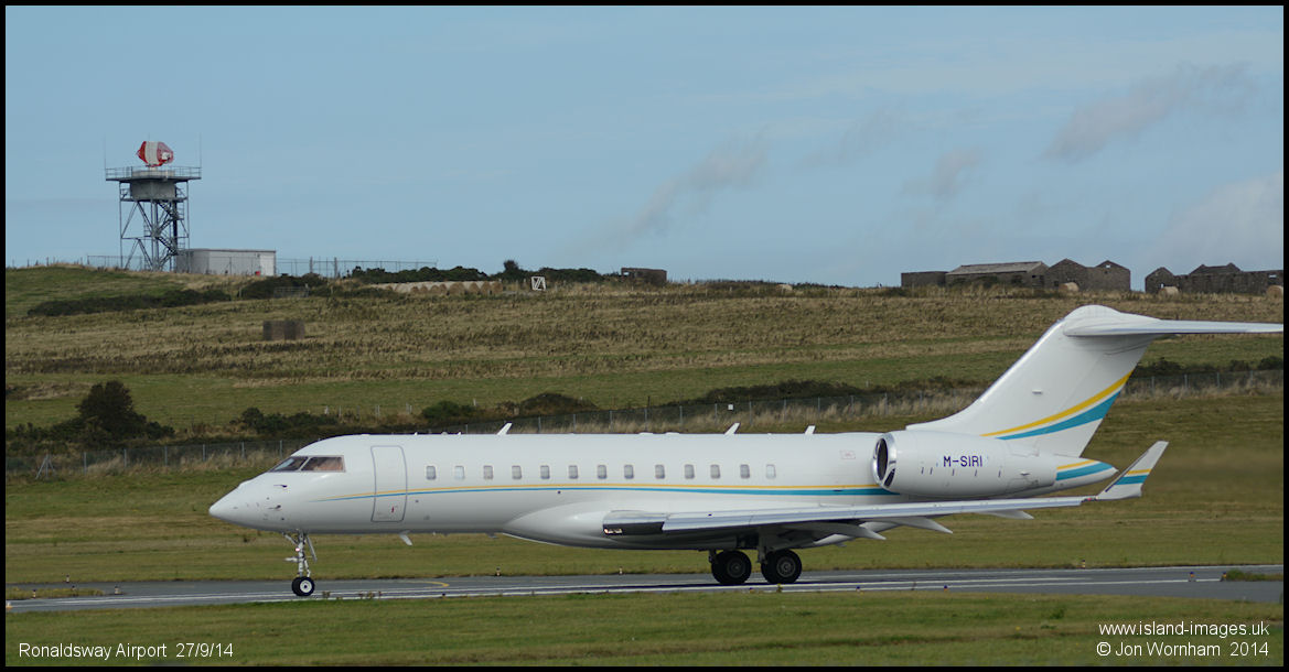 After a short stop at Ronaldsway, Global Express M-SIRI departing from runway 26