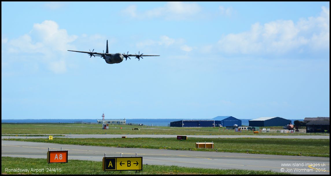 Having flown around the Isle of Man, Raf Hercules ZH867 makes a low 'gear up' pass along Ronaldsway's runway 26 before setting course