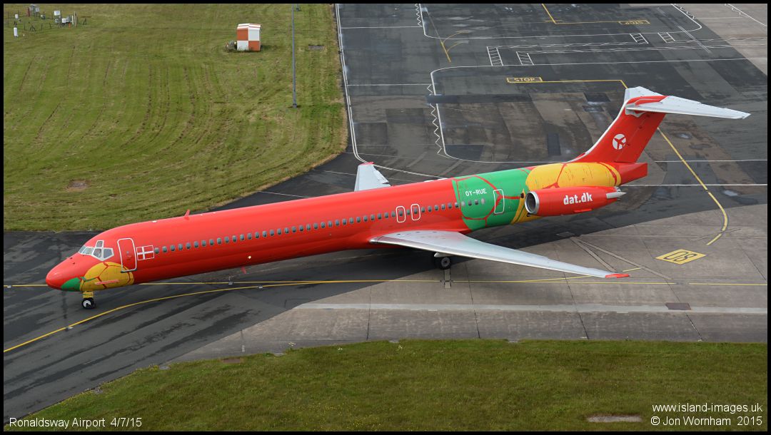 After dropping off local competitors from the 2015 Island Games, MD83 OY-RUE taxies for a positioning flight back to Jersey to pick up more