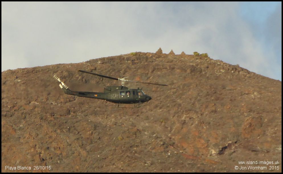 A Spanish Army UH1H Huey transits along a mountain ridgline near Playa Blanca