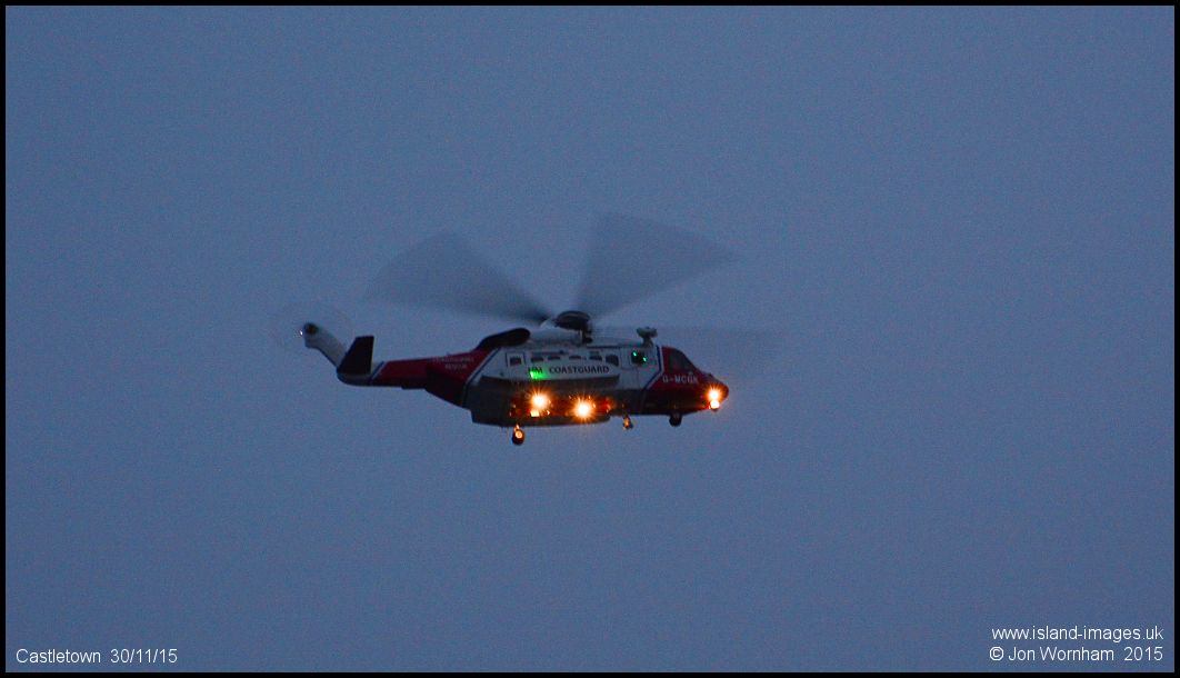Coastguard Sikorsky S92A GMCGK climbs away from Ronaldsway at dusk