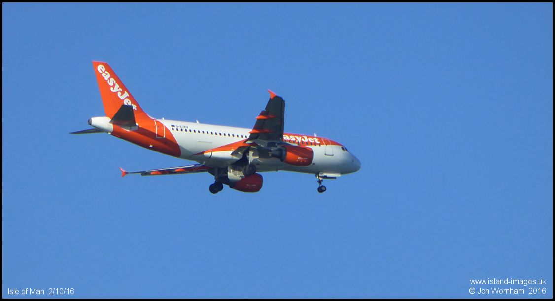 EasyJet Airbus A319 G-EZEV descending on an ILS approach to runway 08 at Ronaldsway