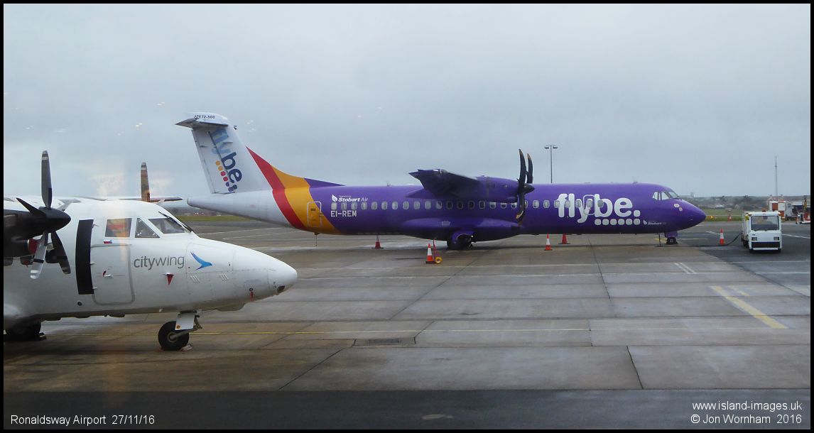 Stobart Air ATR72-500 EI-REM on stand at Ronaldsway ready to operate services for FlyBe